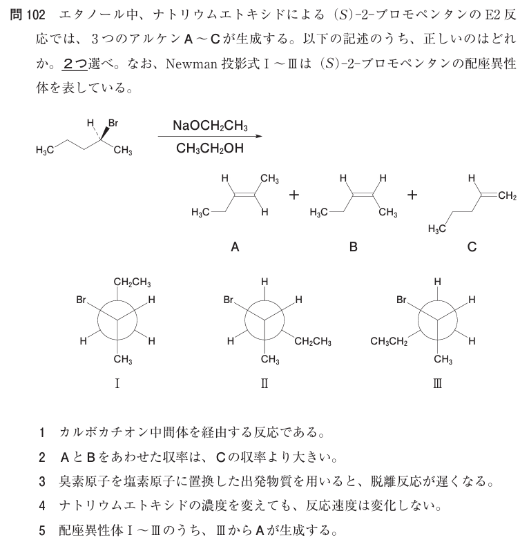 第109回の問102です。E2反応って言ってますよね🤓ちなみにE反応で1題出題されるならE2です(E1ではちょっと選択肢足りなくなるかも・・・)