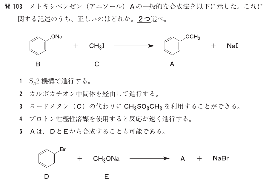 第99回の問103です。反応は置換反応です。なので選択肢1は「SN1反応かSN2反応か」を問われています。E反応なんて出てこないですよね🤓