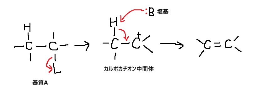 E反応とは脱離反応(elimination)です。生成物はアルケンになります。