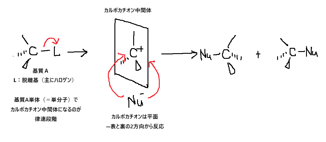 基質Aから脱離基(主にハロゲン。よって「有機ハロゲン化合物の反応」とされることが多い。)が脱離し、カルボカチオン中間体が生成します。これが反応の開始段階であり、これが起こらないと反応は進みません。これが律速段階(一番遅い反応)です。カルボカチオンというのは電子が不足した不安定な状態なので、わざわざ不安定な状態に変化する反応は起こりにくいですもんね🤔