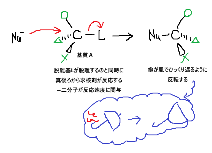 機構はこんな感じです。SN1との違いを明確にしておきましょう🤓中間体を経由せずに、二分子が関与して一気に反応が進みます。