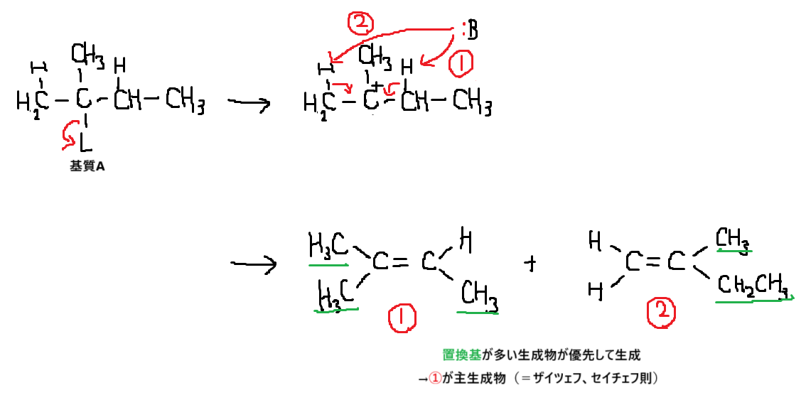 複数のアルケンが生成する場合、置換基が多い安定な生成物が主生成物となります。これをザイツェフ則やセイチェフ則と言います。