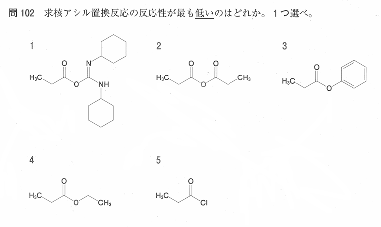 続いてこちらも反応に関する出題です。カルボン酸誘導体の反応性(付加脱離反応)に関する問題です😄