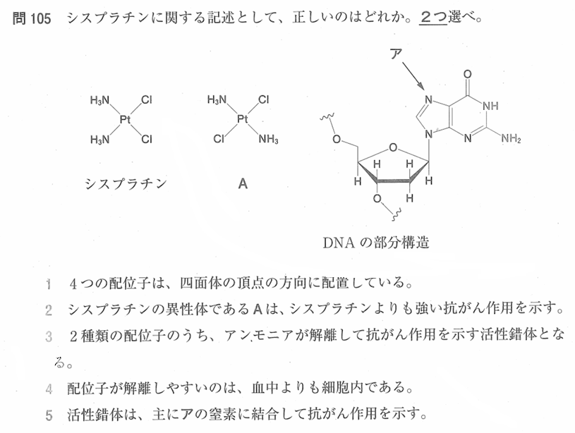 選択肢2は、“シス”プラチンというくらいなので、シス体が一番活性がありそうですよね🤨よって「誤」です。