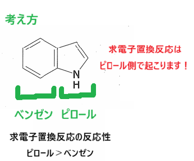まず、インドールの求電子置換反応は反応性が高い「ピロール側」で起こります。この考え方は別の記事で説明しております。