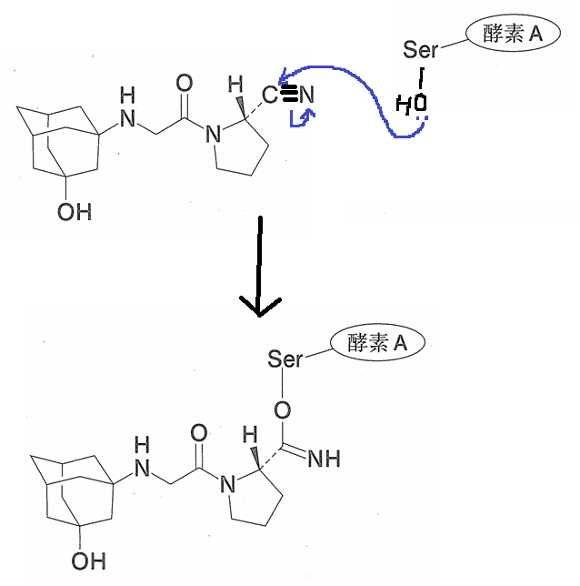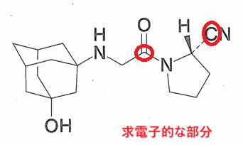 ヒントは“セリン残基の求核攻撃により~”です。セリン残基-OHと反応するのは求電子的な部分となります。